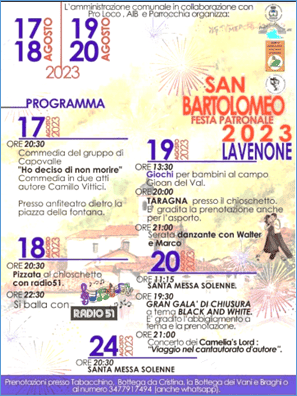 GIOVEDI' 24 AGOSTO 2023 San Bartolomeo, apostolo (festa) - PATRONO DI LAVENONE 20.30 LAVENONE S.Messa Solenne per la Festa Patronale